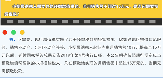 第四個(gè)問(wèn)題:小規(guī)模納稅人需要異地預(yù)繳增值稅的。若月銷售額不超過(guò)15萬(wàn)元。是否還需要預(yù)繳稅款?