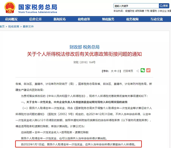文件中明確:自2022年1月1日起,個人取得年終獎不再適用優(yōu)惠算法,即不能再單獨計稅,應(yīng)并入當(dāng)年綜合所得計算繳納個人所得稅。