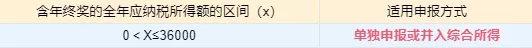 2、當(dāng)年收入(含年終獎)減去6萬及三險一金、附加扣除等后應(yīng)納稅所得額≤36000
