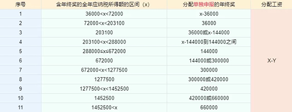 當(dāng)含年終獎的全年應(yīng)納稅所得額大于36000時,由于年終獎單獨申報存在雷區(qū)等原因,為使稅負(fù)最低,可在年終獎和工資之間進行分配,分配的年終獎按照全年一次性獎金單獨申報。